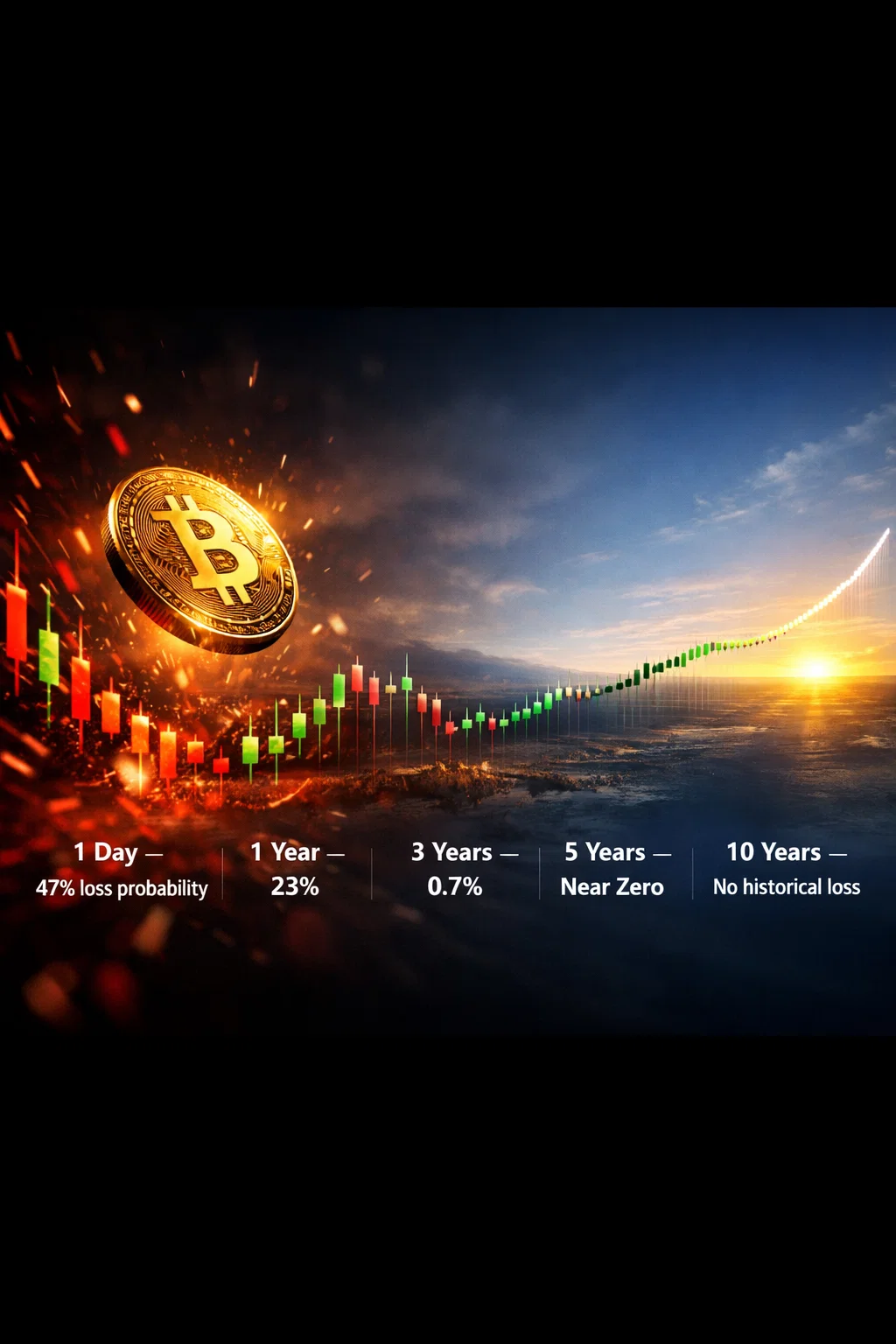 Over a one-year holding period, the probability of losing money drops meaningfully. Market structure begins to matter more than noise. Supply dynamics, halving cycles, capital flows, and adoption trends start influencing outcomes.